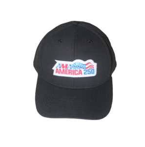 The AMA America 250 Hat prominently features the AMA America 250 logo embroidered in red, white and blue. The hat has a Velcro closure for easy adjustment.