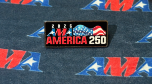 This limited-edition lapel pin celebrates America 250. The pin is silver metal with a black background. The 2026 AMA America 250 logo is featured prominently in blue and red with a waving American flag.